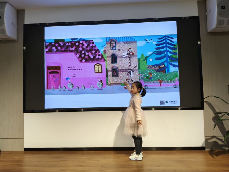 活动伊始,吉老师以“你收到过最棒的礼物是什么”为话题,引导孩子们结合自身经历分享心声。孩子们踊跃举手,稚嫩的话语中满是童真与暖意,瞬间点燃了现场氛围。随后,吉老师带领大家走进奇妙的动物世界:1只长颈鹿、2只河马、3只棕熊、4只老虎、5只山羊……孩子们在生动的故事场景中,不知不觉间掌握了数字概念。当讲到动物们带着“长长的、圆圆的、香香的”礼物登场时,吉老师邀请孩子们上台猜测礼物的形状与内容,充分激发了大家的想象力与表达欲。