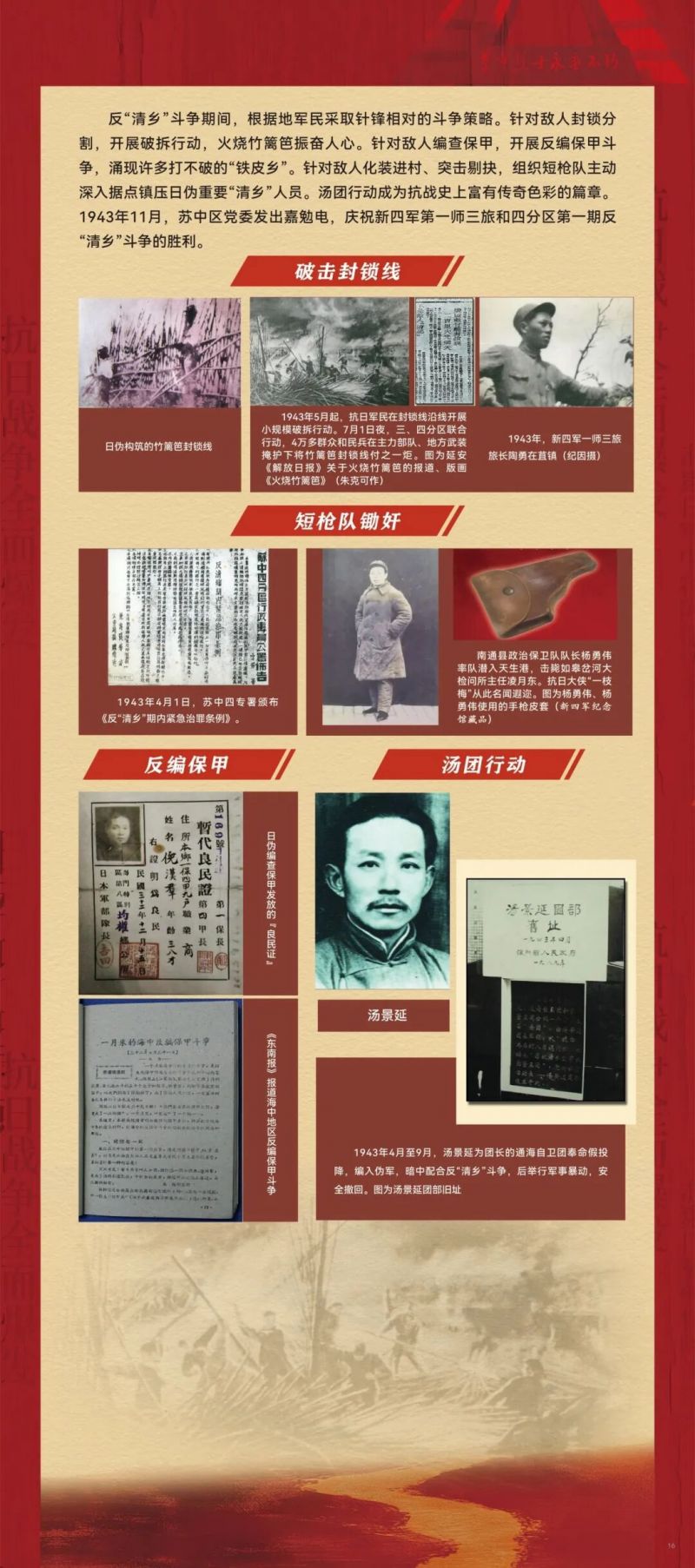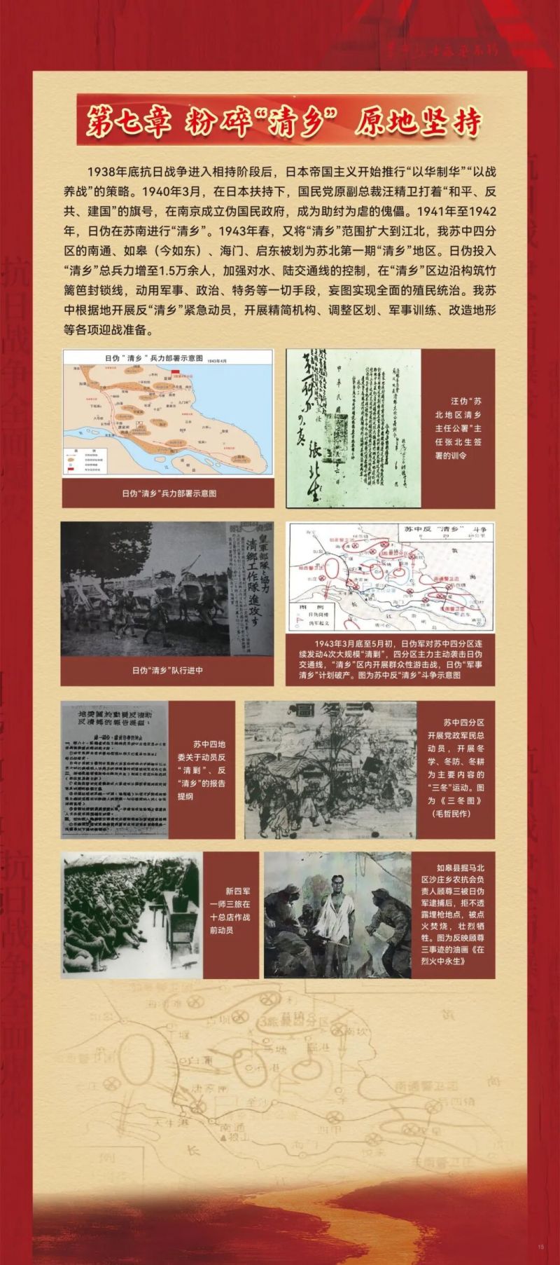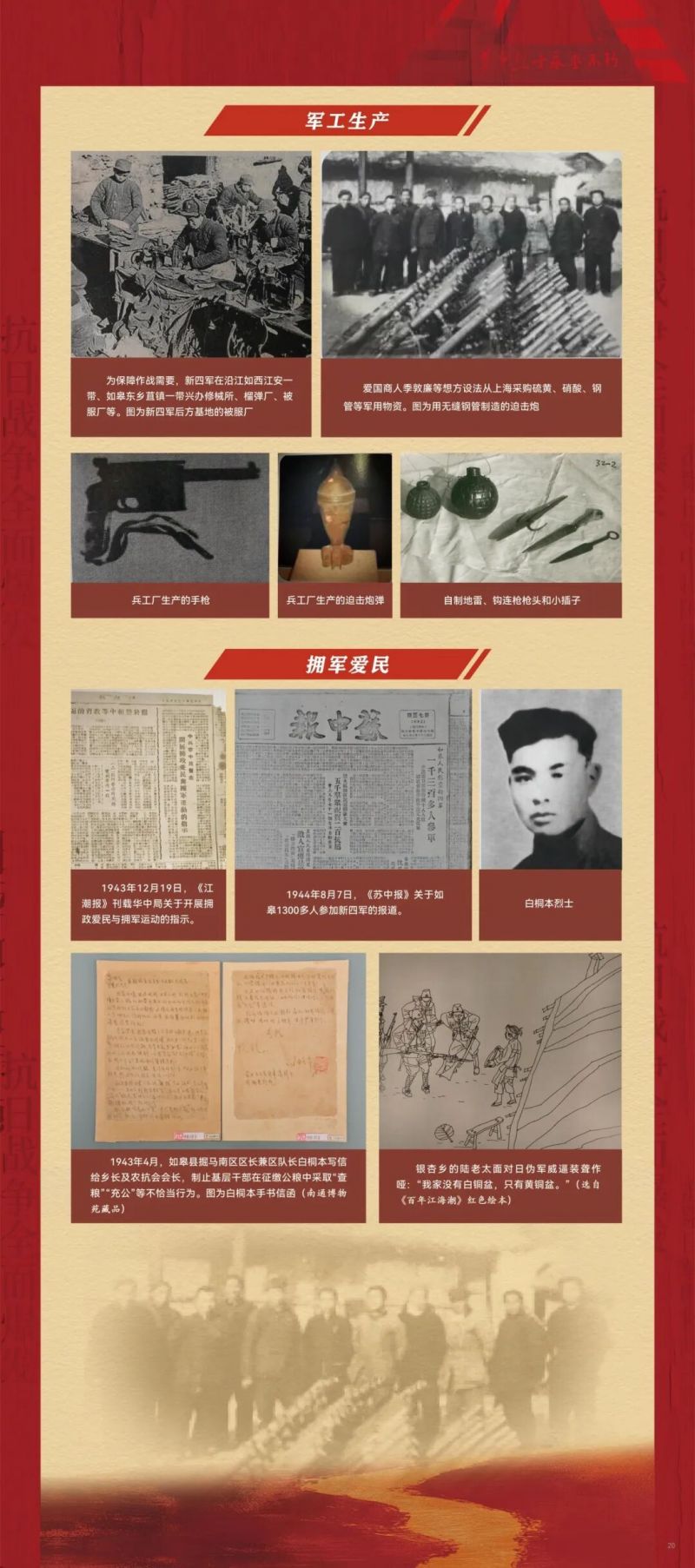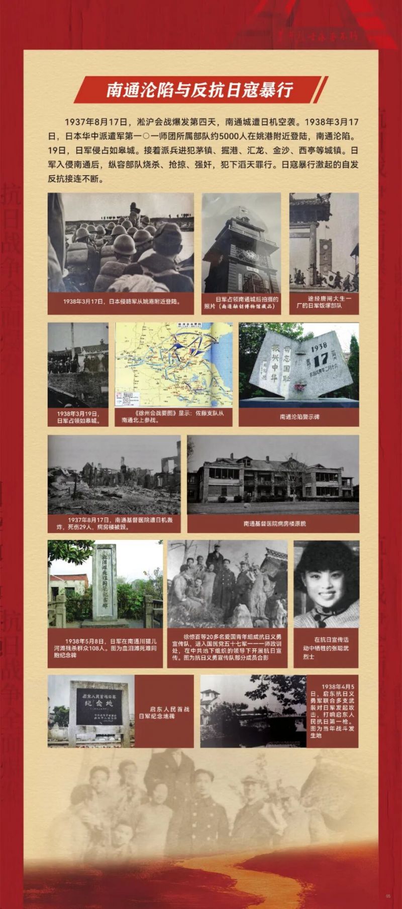 展出内容全景呈现了在中国共产党领导下的新四军与南通人民并肩作战,相继开展反摩擦、反“扫荡”、反“清乡”、反据点斗争,创造了在平原水网地区长期原地坚持斗争的辉煌战果,取得抗日战争的伟大胜利,谱写了一曲壮丽的史诗。