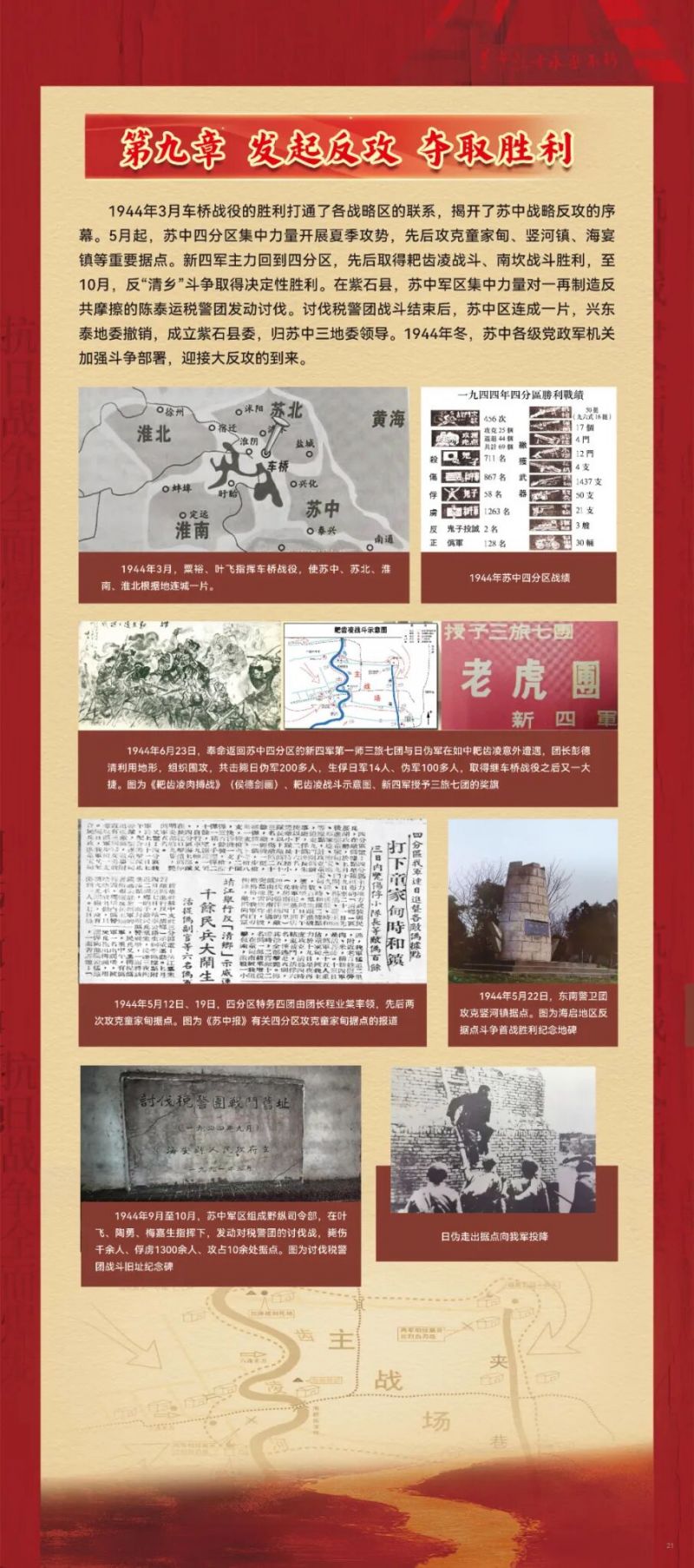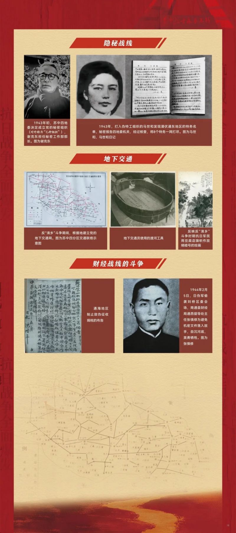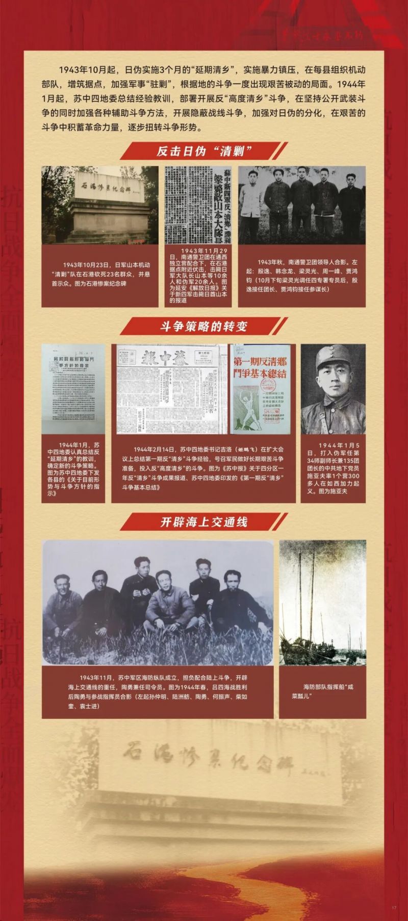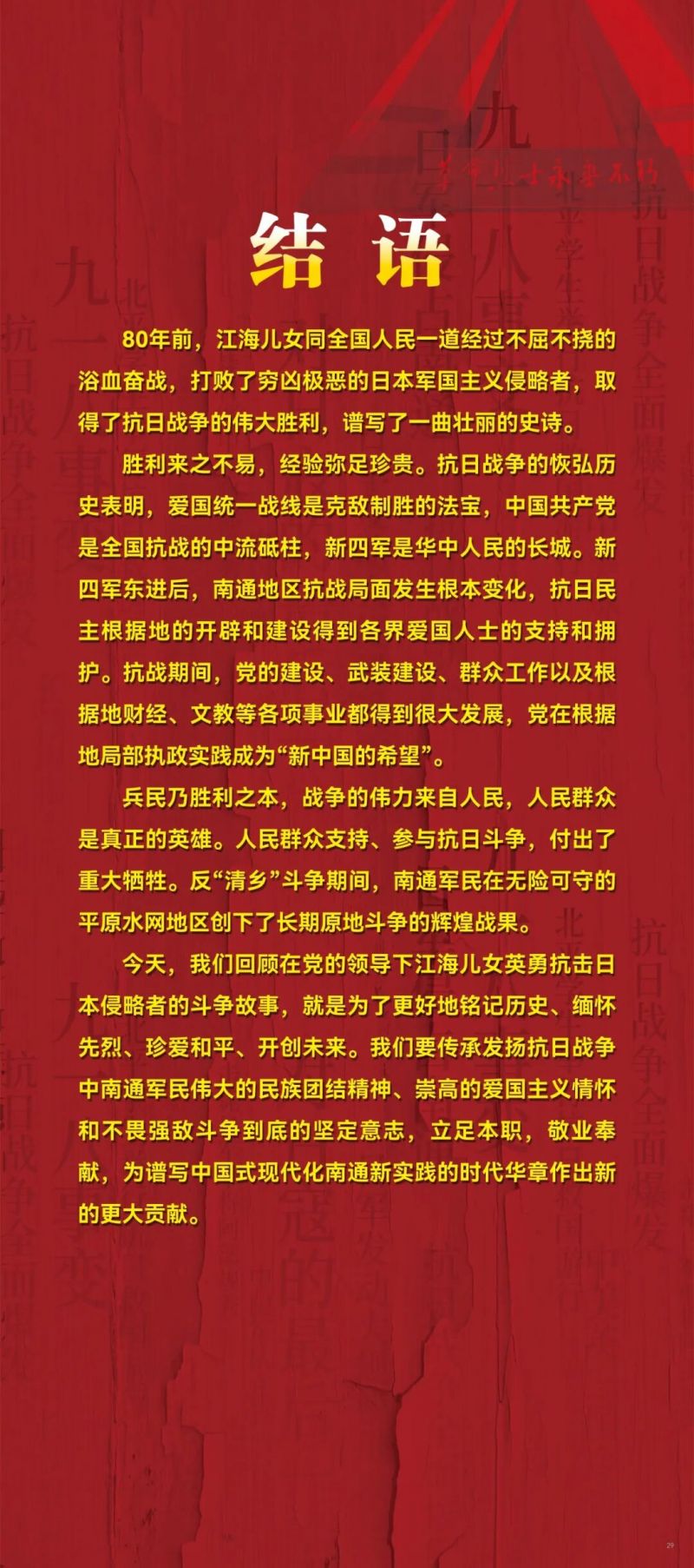 展出内容全景呈现了在中国共产党领导下的新四军与南通人民并肩作战,相继开展反摩擦、反“扫荡”、反“清乡”、反据点斗争,创造了在平原水网地区长期原地坚持斗争的辉煌战果,取得抗日战争的伟大胜利,谱写了一曲壮丽的史诗。