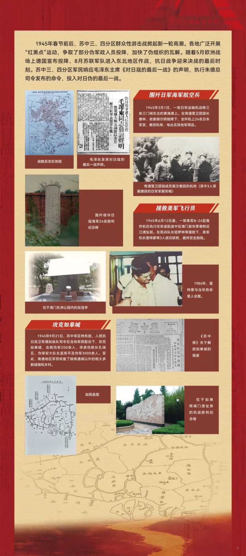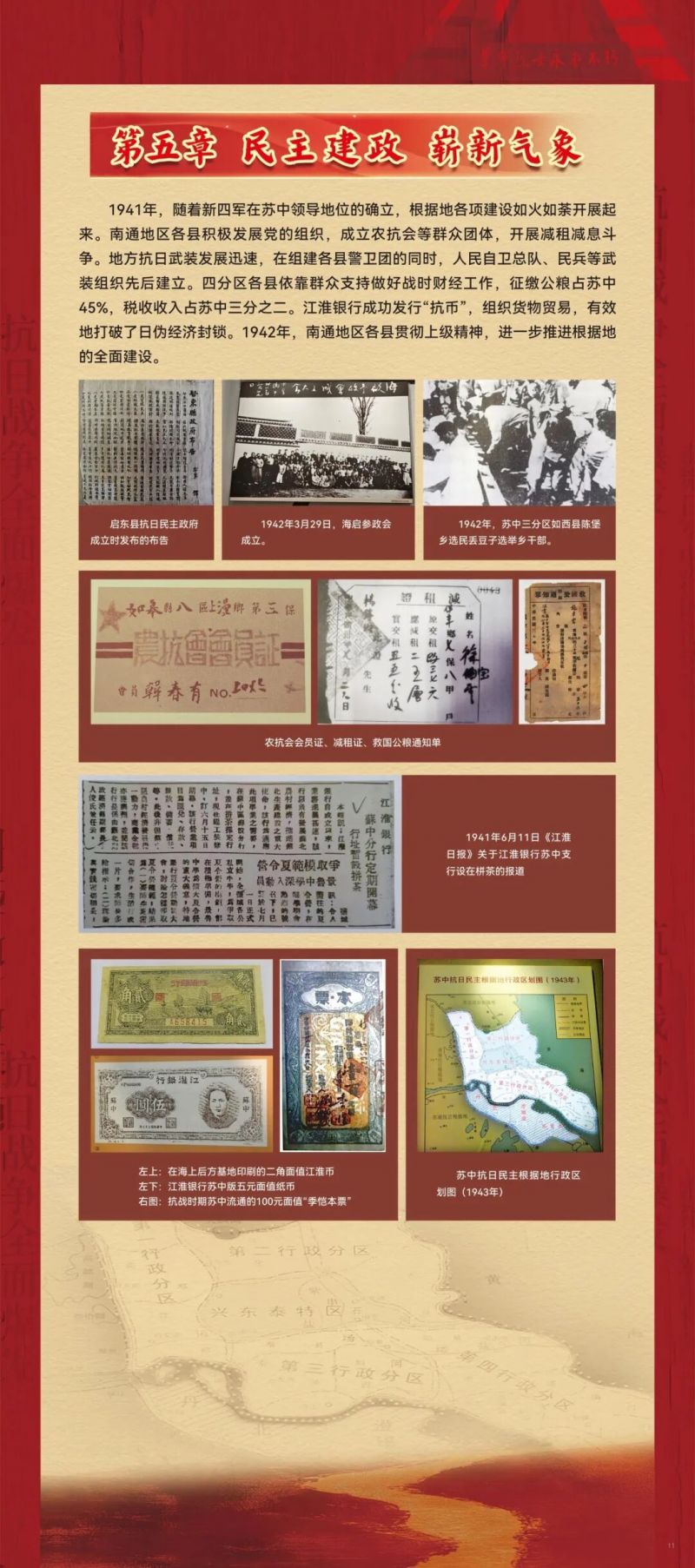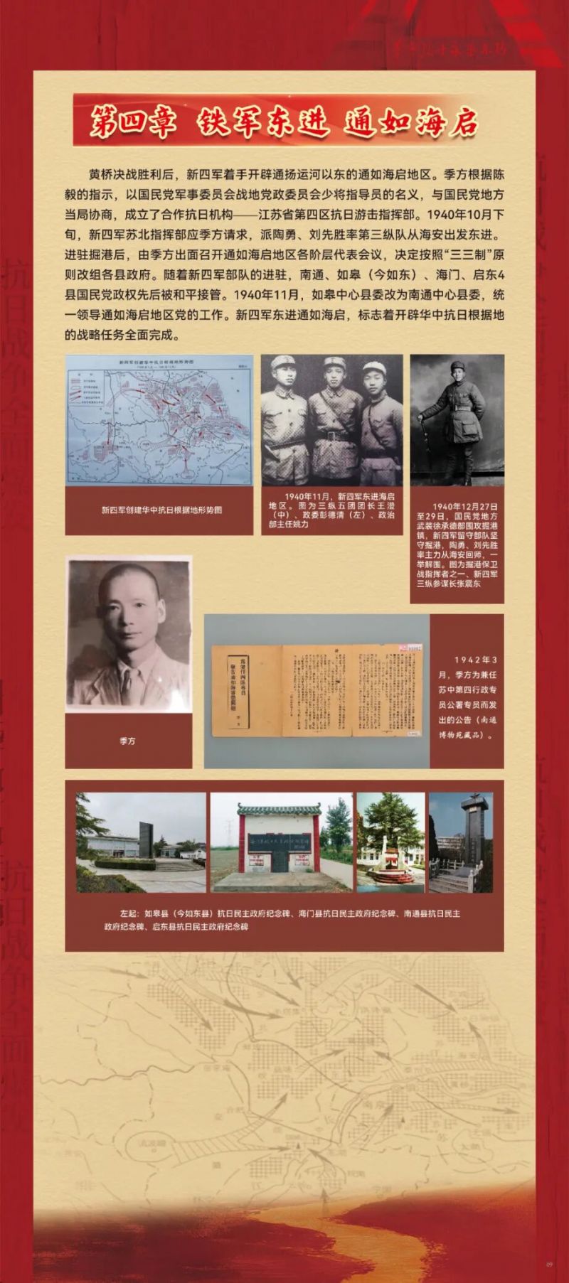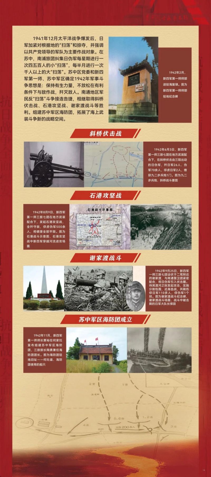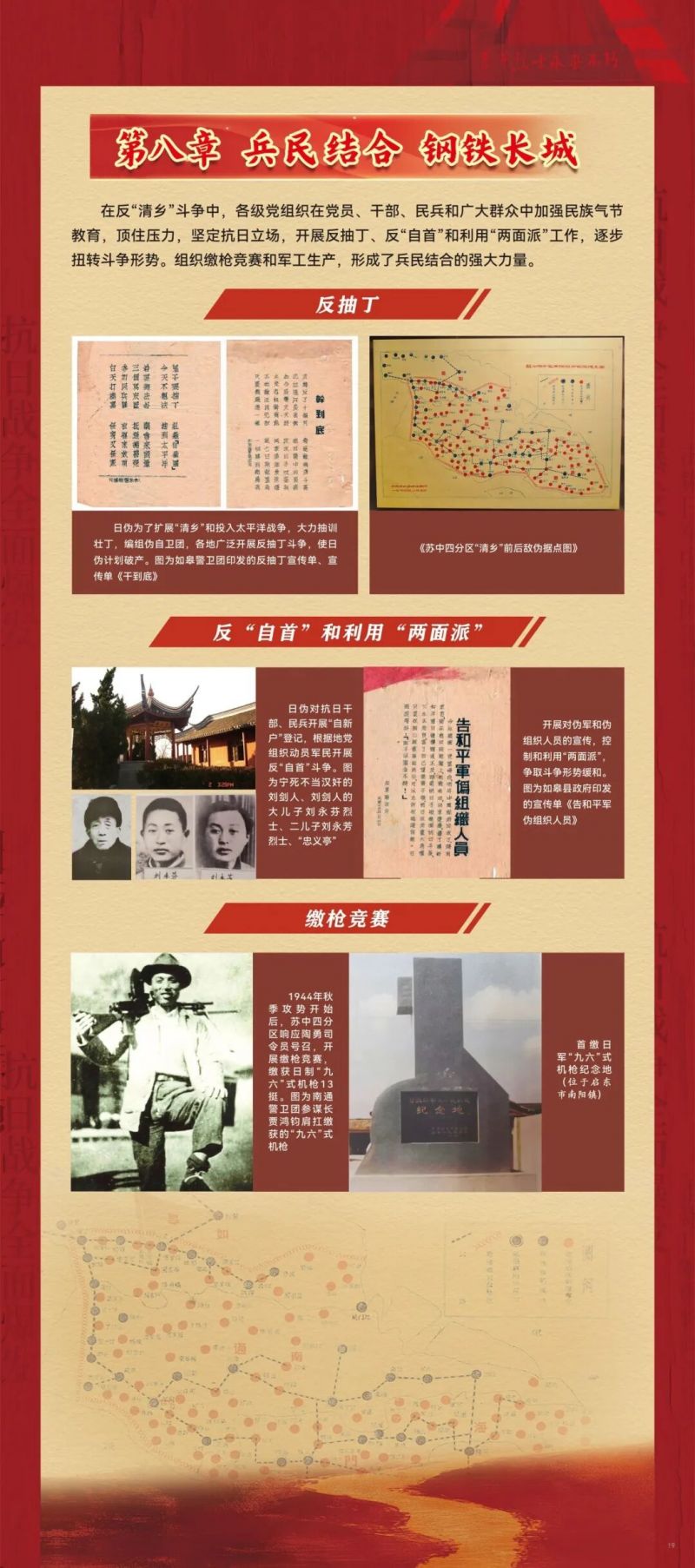 展出内容全景呈现了在中国共产党领导下的新四军与南通人民并肩作战,相继开展反摩擦、反“扫荡”、反“清乡”、反据点斗争,创造了在平原水网地区长期原地坚持斗争的辉煌战果,取得抗日战争的伟大胜利,谱写了一曲壮丽的史诗。