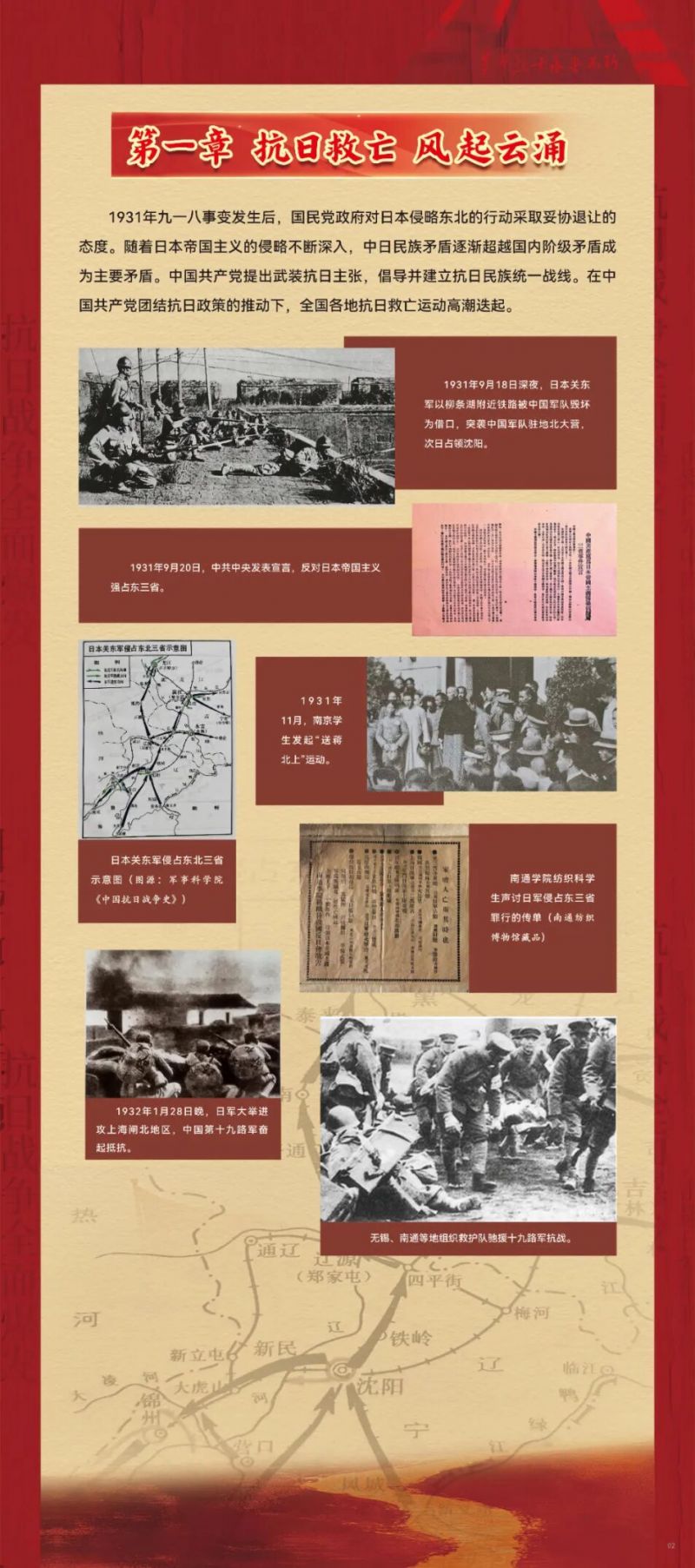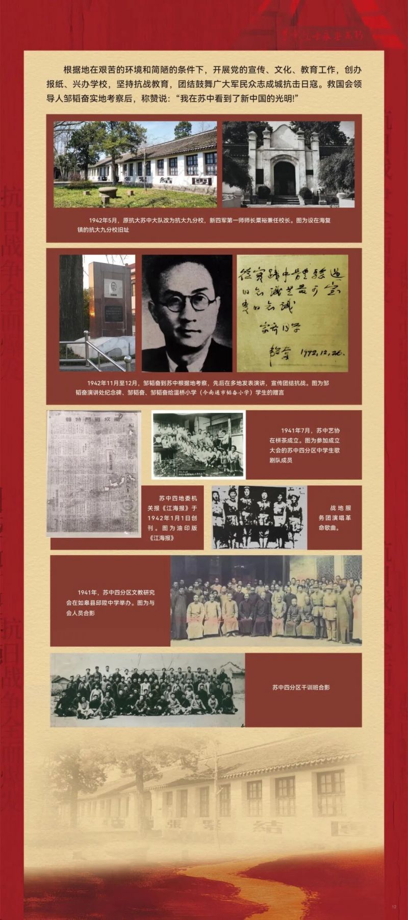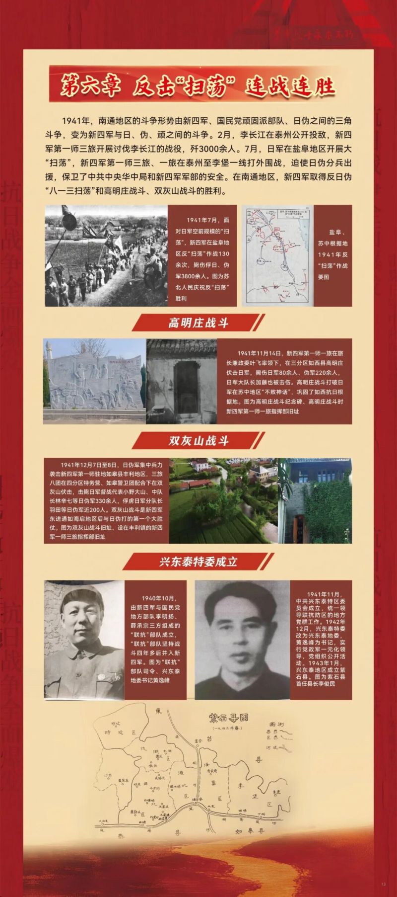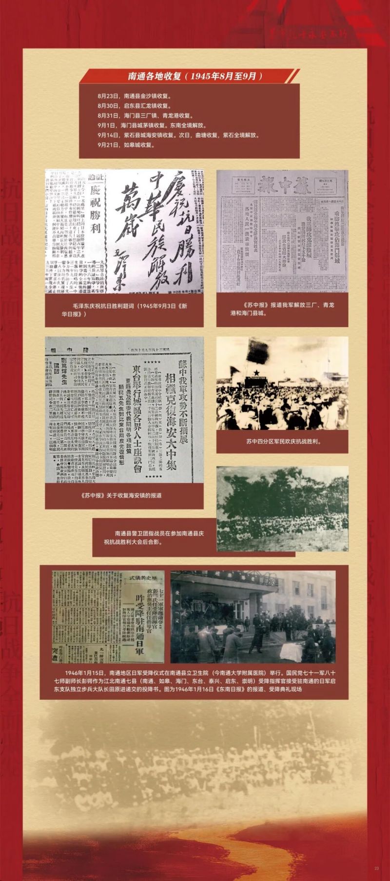 展出内容全景呈现了在中国共产党领导下的新四军与南通人民并肩作战,相继开展反摩擦、反“扫荡”、反“清乡”、反据点斗争,创造了在平原水网地区长期原地坚持斗争的辉煌战果,取得抗日战争的伟大胜利,谱写了一曲壮丽的史诗。